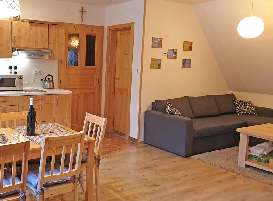 Milovníky světlých podkrovních prostorů a výhledů do okolních kopců potěší prostorný apartmán Kneipp.